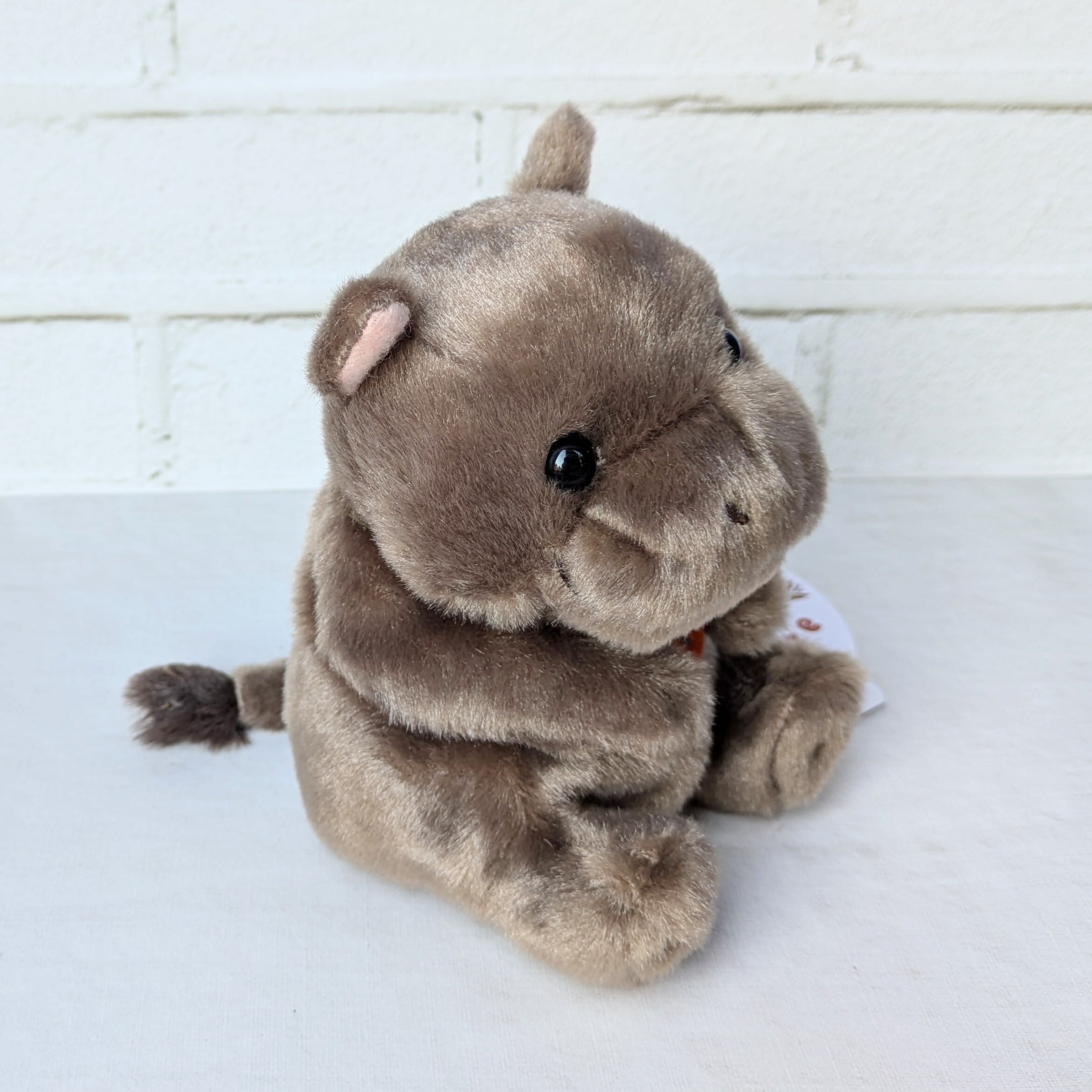 つやつやな毛の感じや、愛くるしい表情、ぽってりとしたフォルムや長い尻尾もかわいい、小さなカバさん。