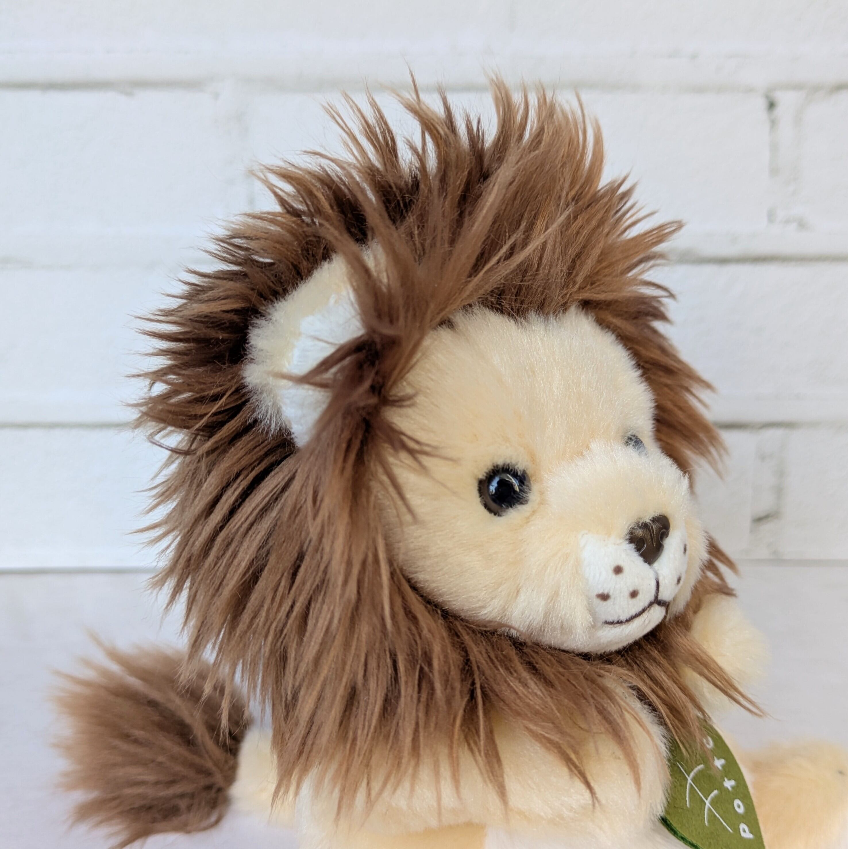 立派なたてがみや、どこかあどけない表情、長い尻尾もかわいい、ライオンさん。