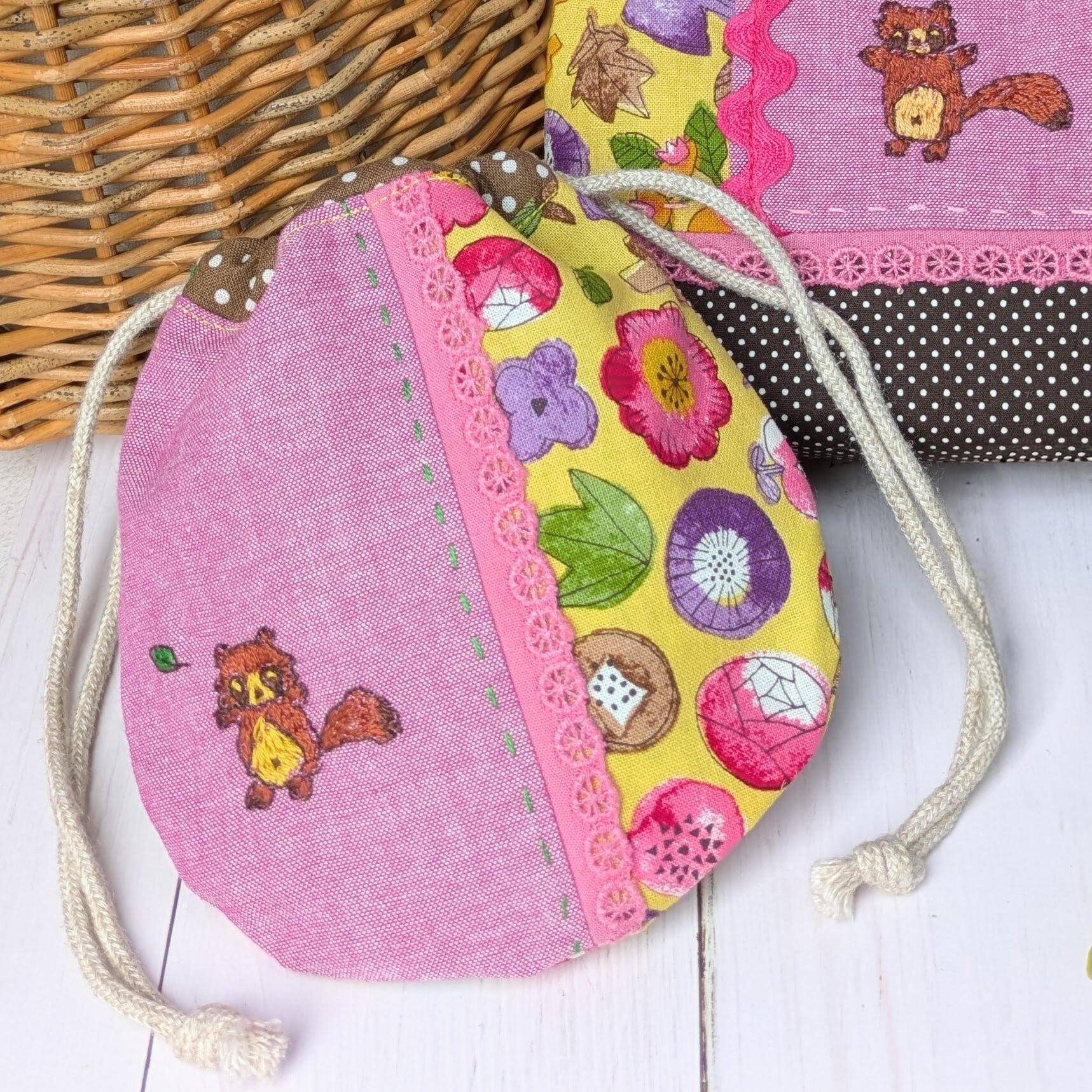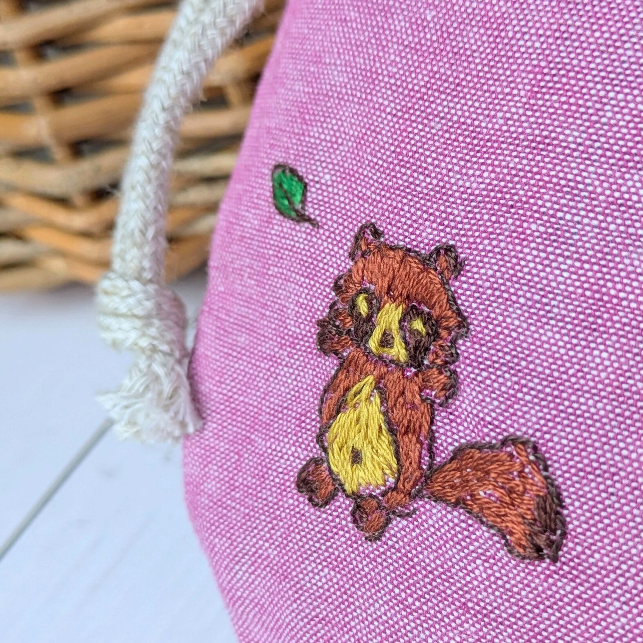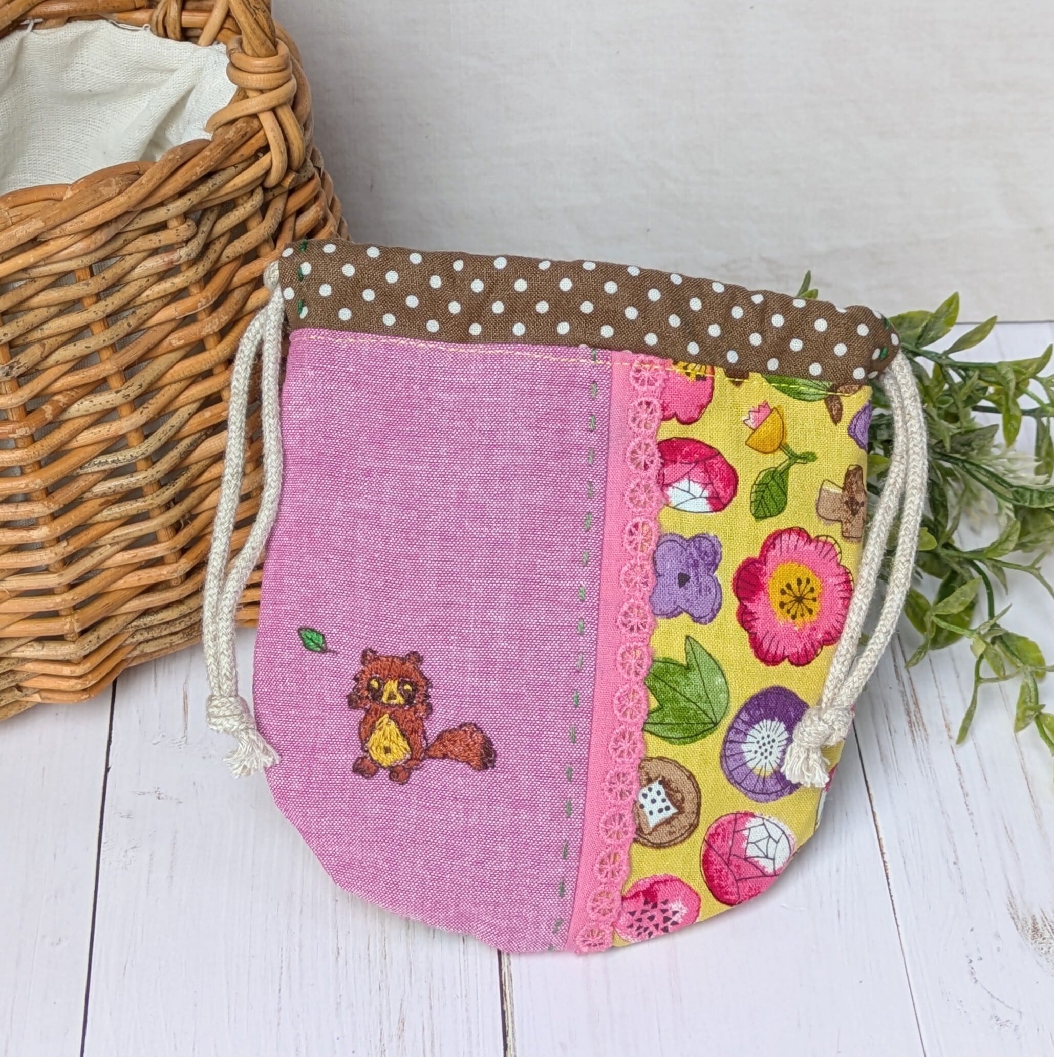 【pig tails】さん / 丸巾着・刺繍入り(たぬき)