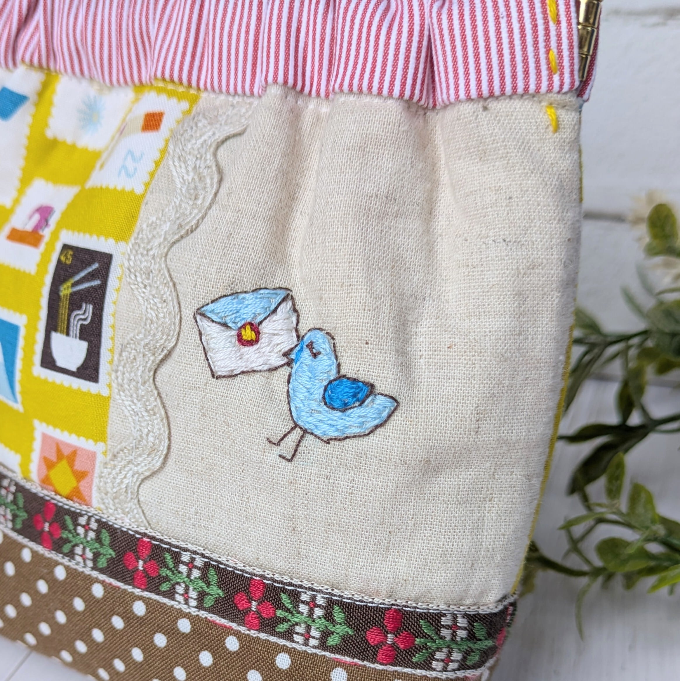 お手紙を運ぶ優しいお顔の[青い鳥]さんの刺繍もよく映えています。