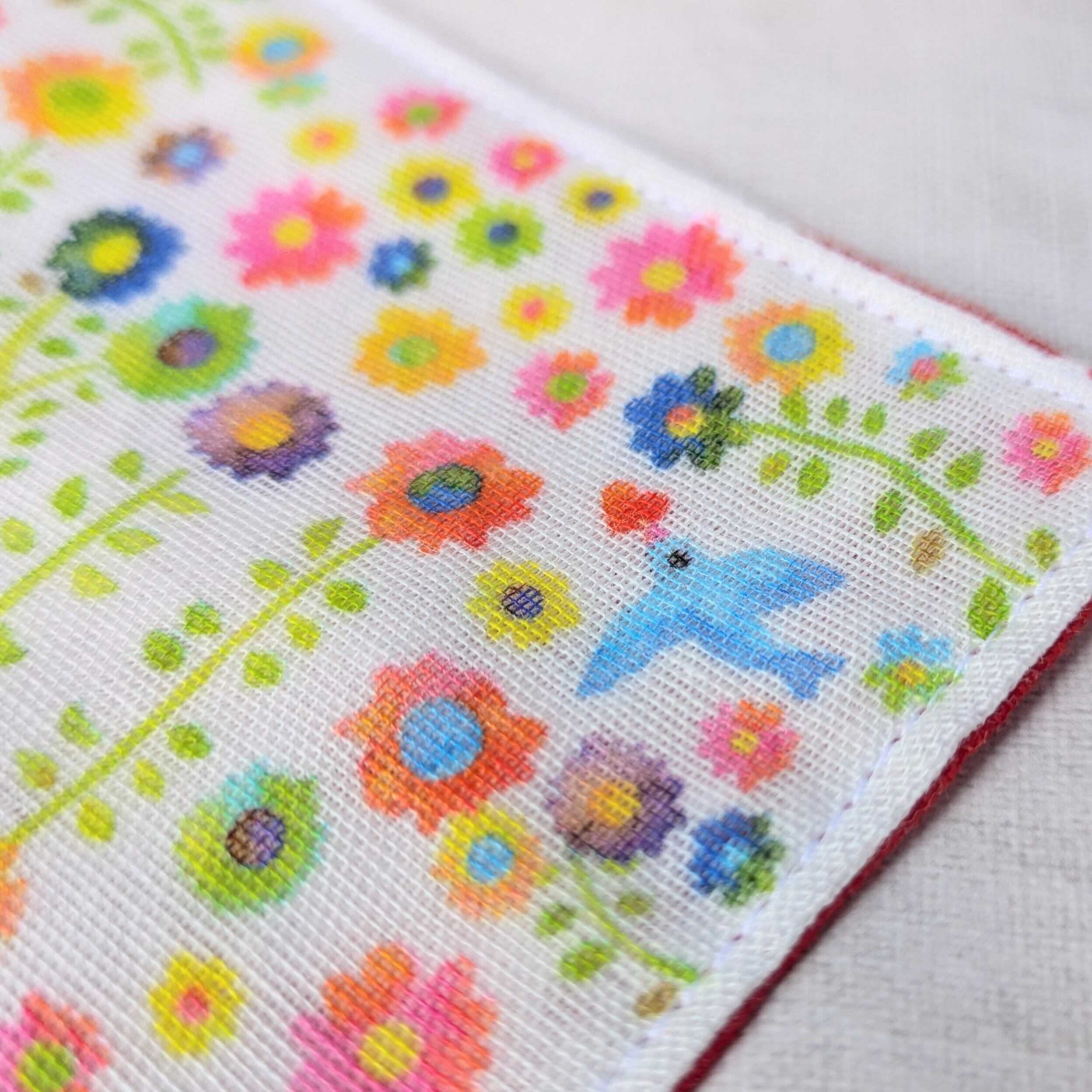 生地全面にプリントされたパターン柄で、明るく楽しい雰囲気のハンカチに仕上がっています♪