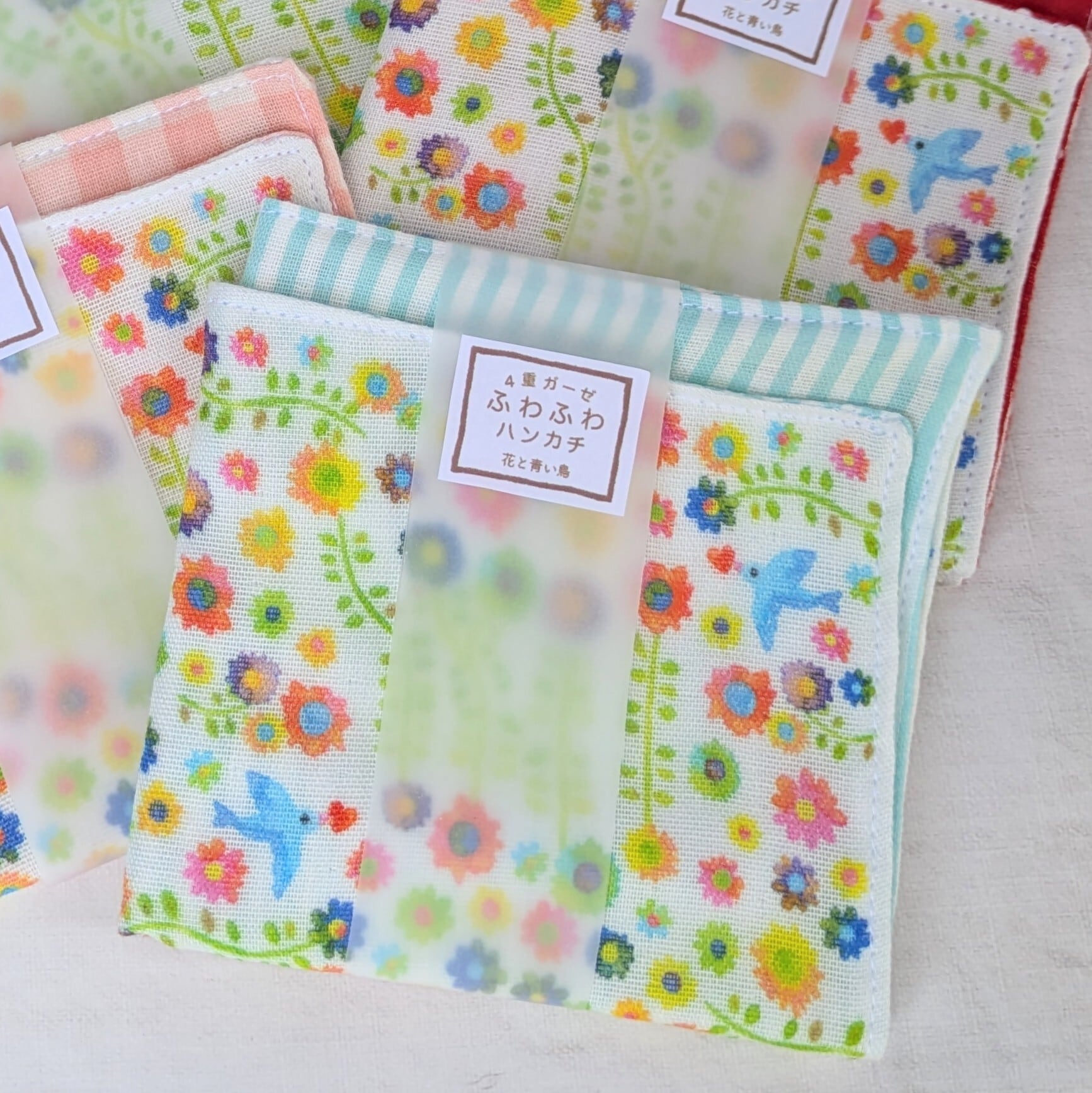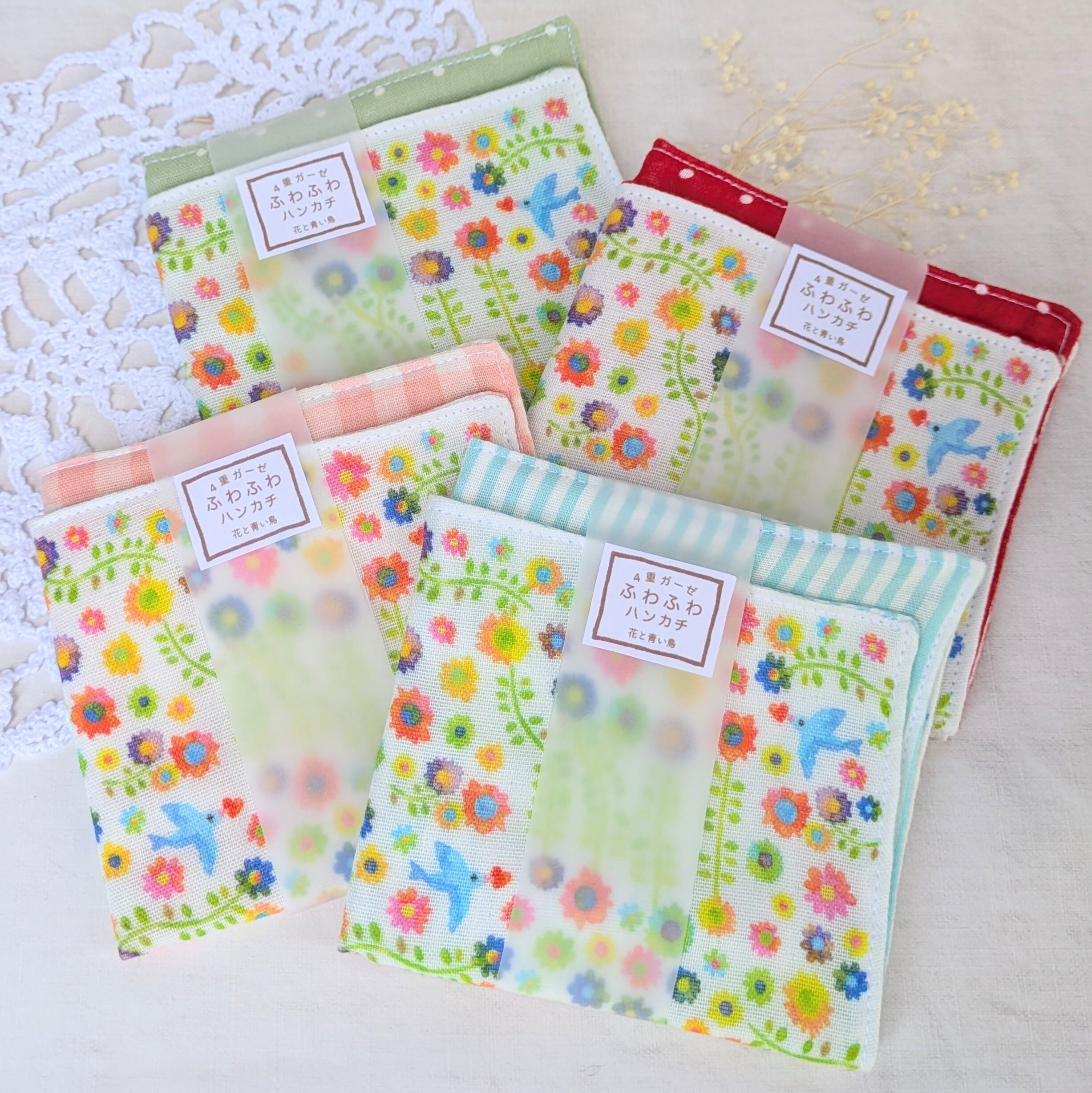 【nana】さん / イラスト・4重ガーゼハンカチ[花と青い鳥]