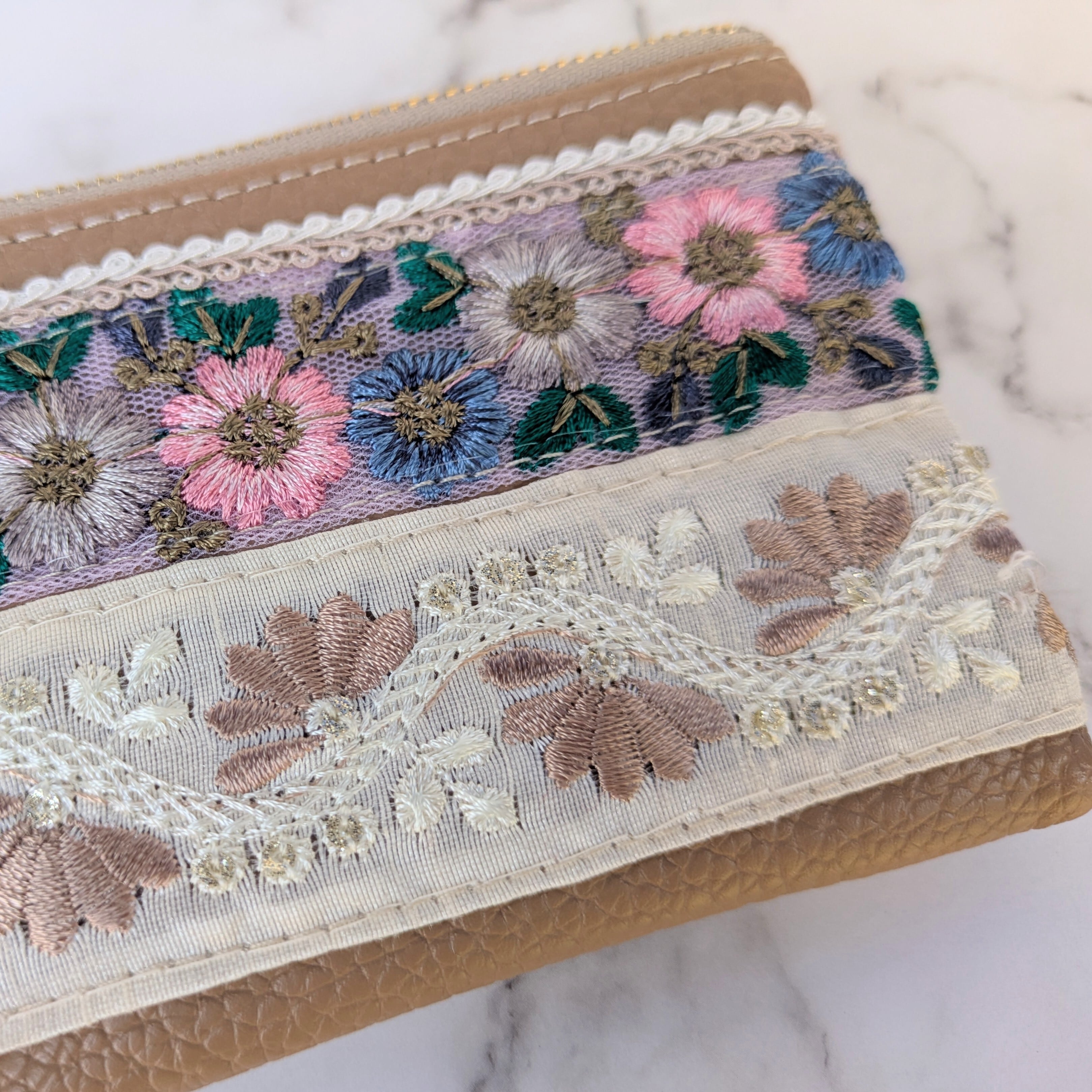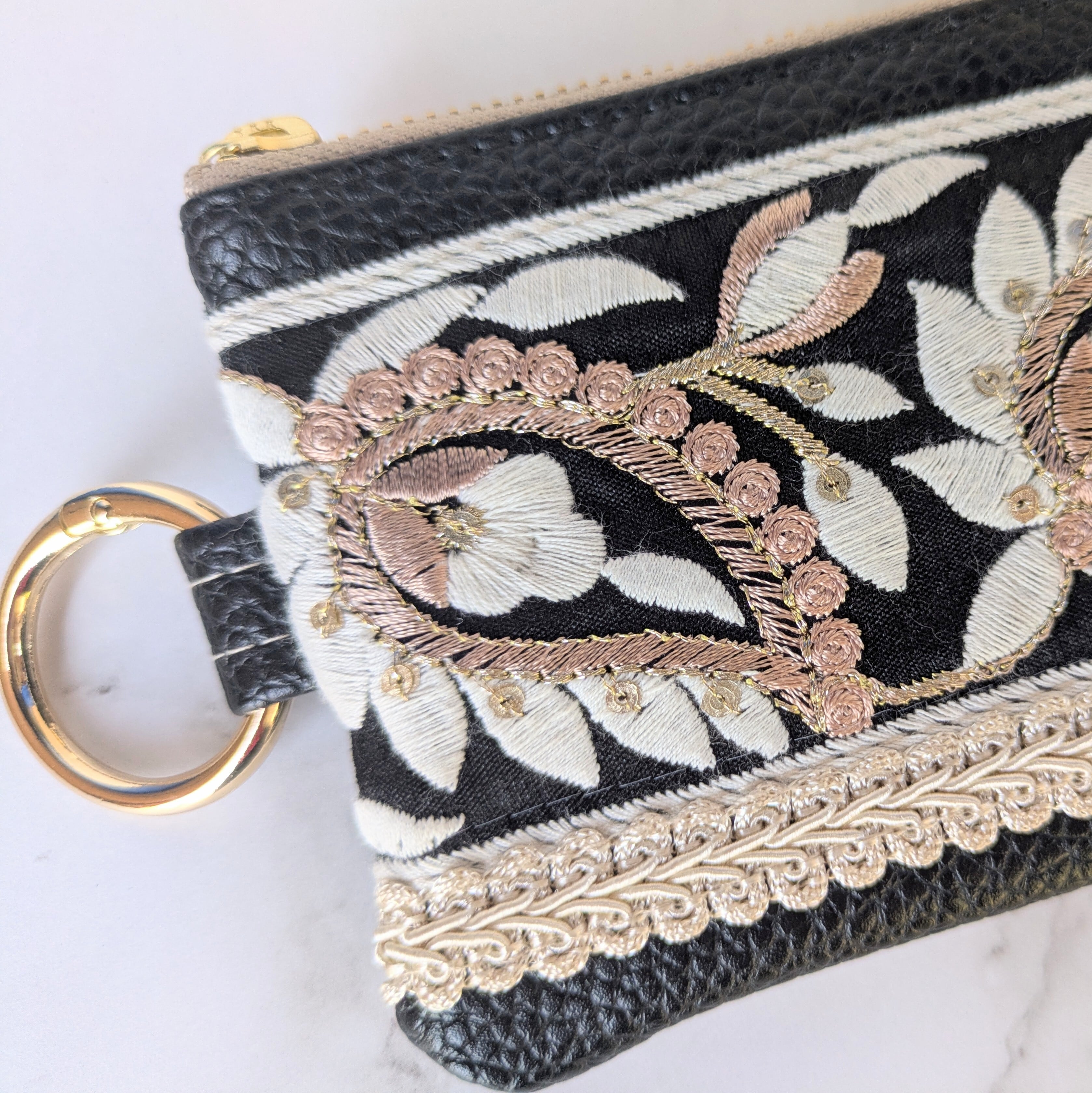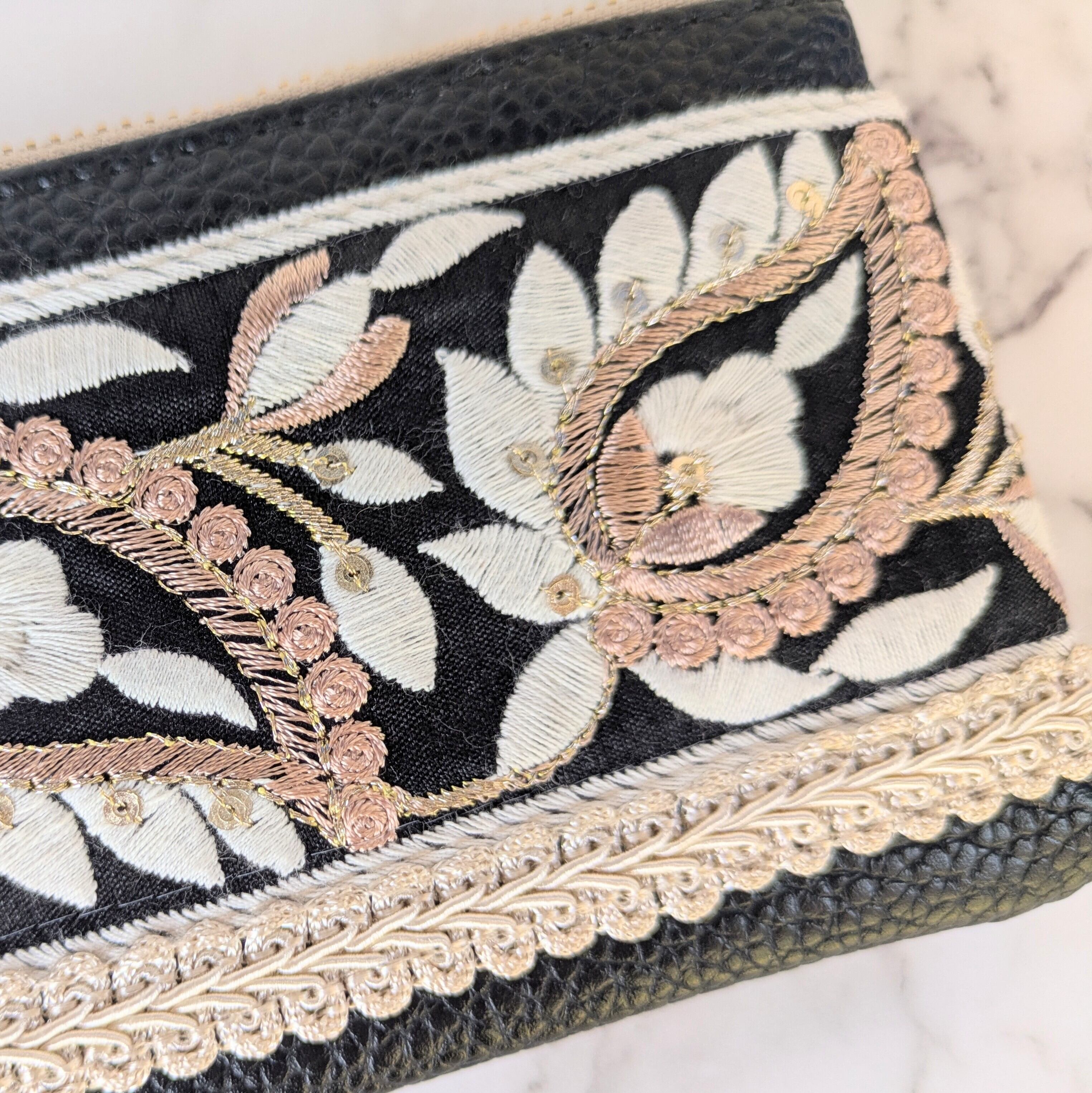 フェイクレザーのベースに刺繍入りリボンやブレードを縫い留めた洒落たデザインはそのままに、カードケースなどにも使いやすいサイズでの登場です。