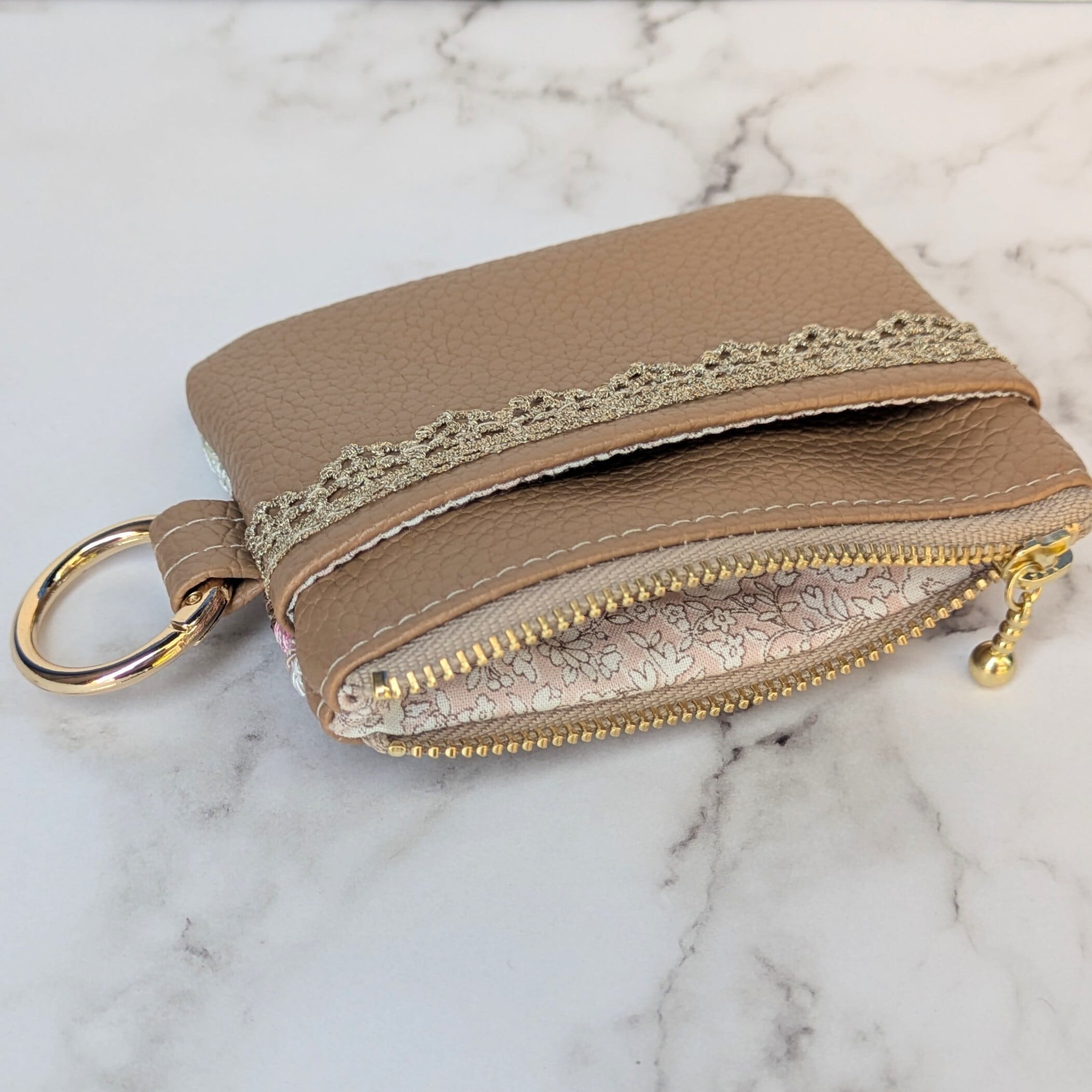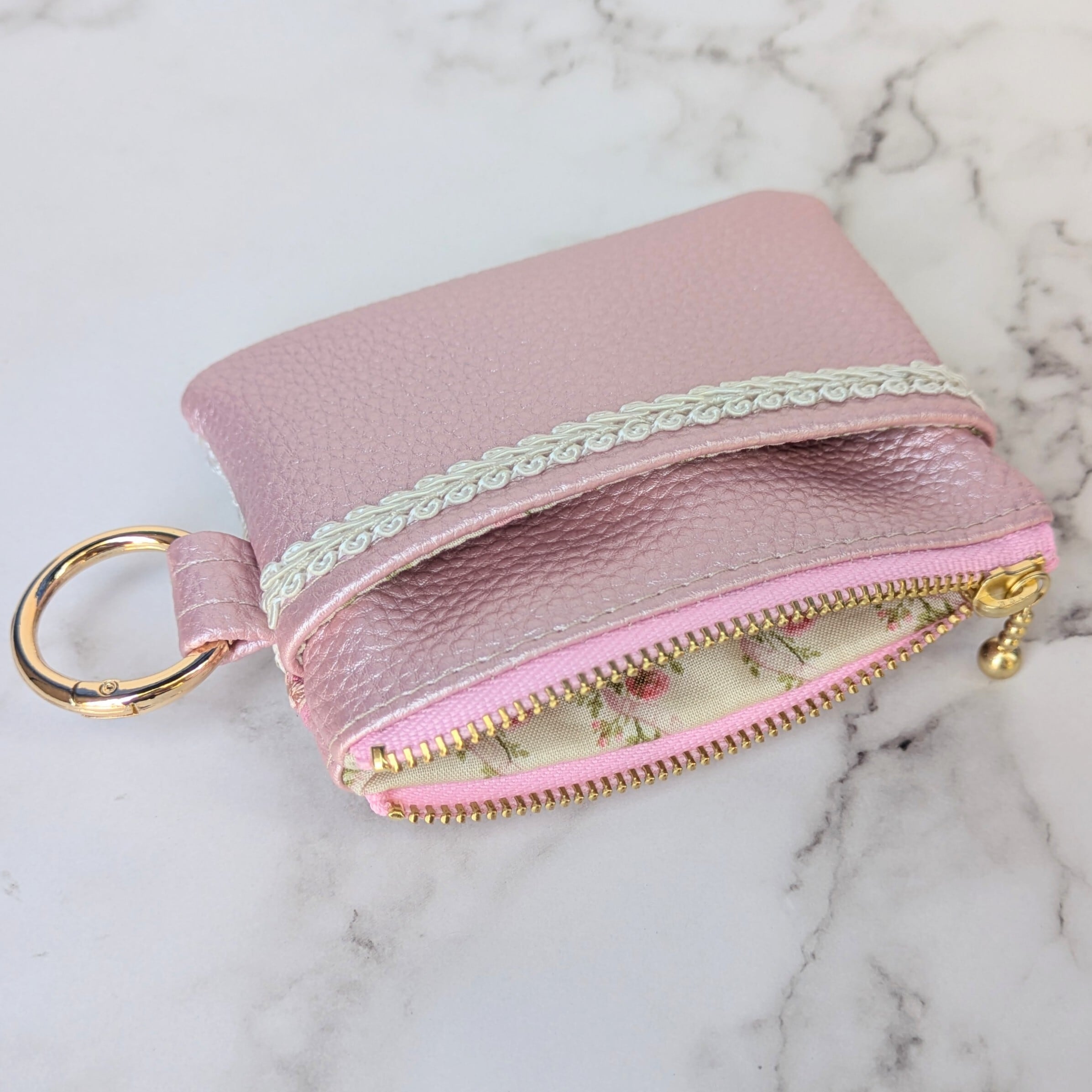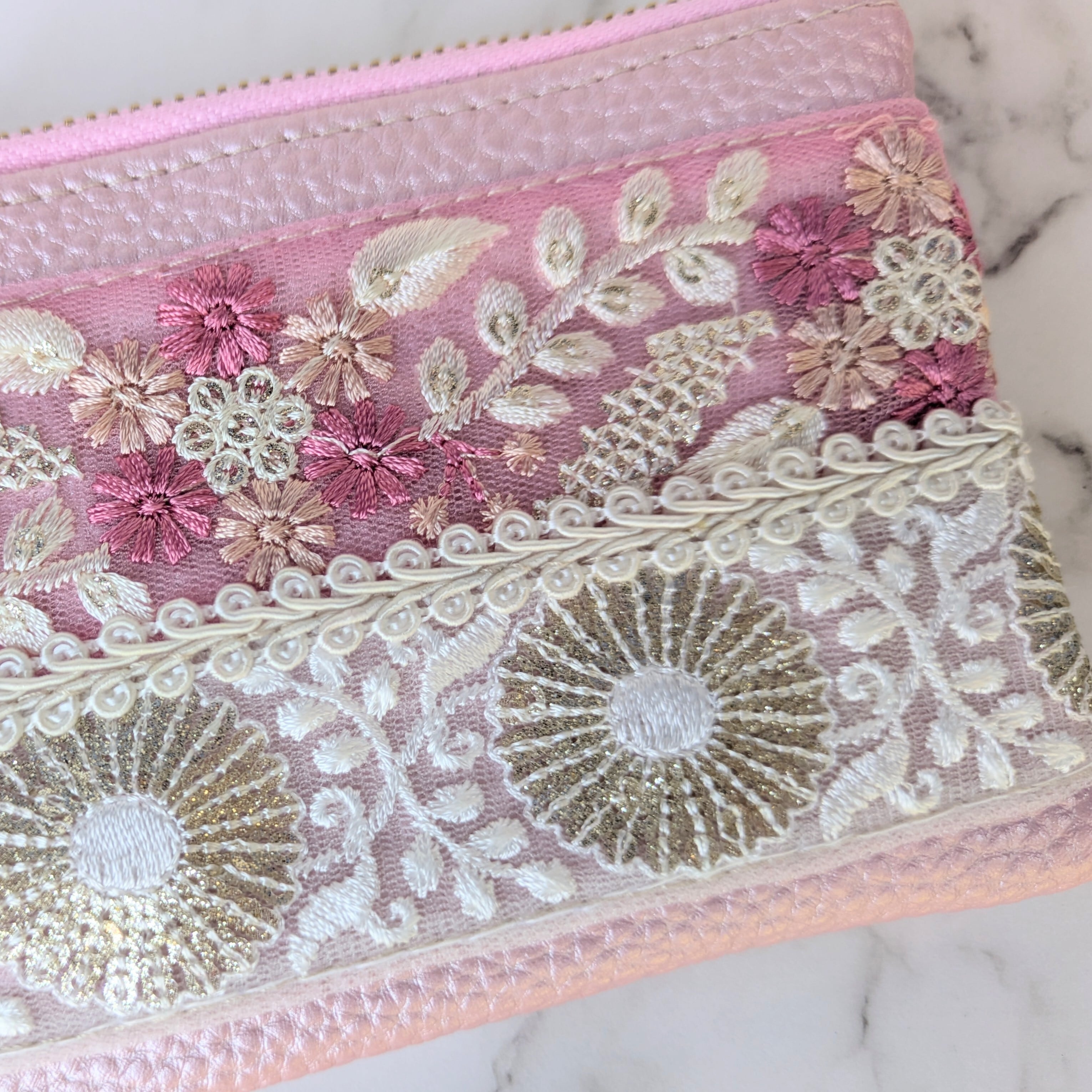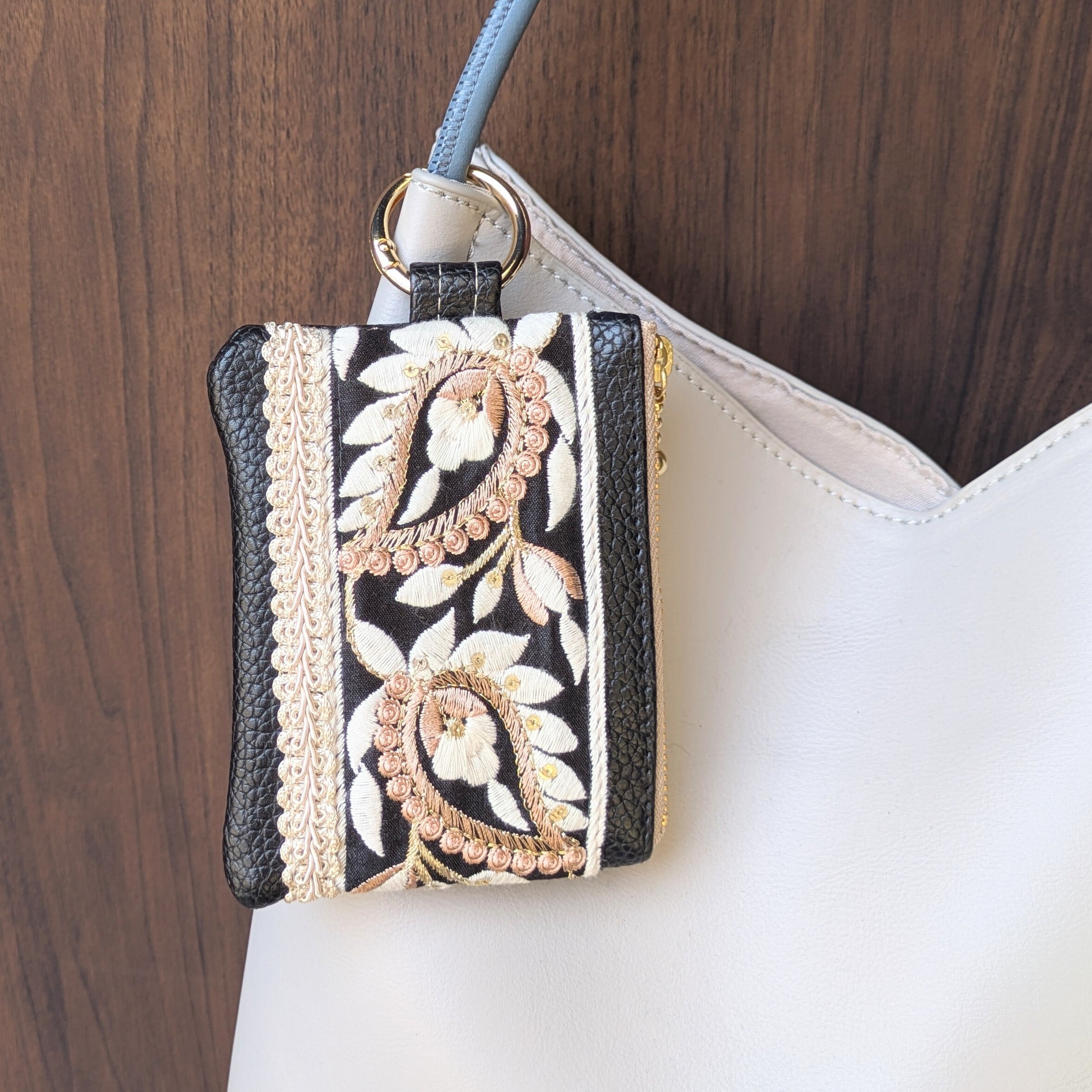 フェイクレザーのベースに刺繍入りリボンやブレードを縫い留めた洒落たデザインはそのままに、カードケースなどにも使いやすいサイズでの登場です。