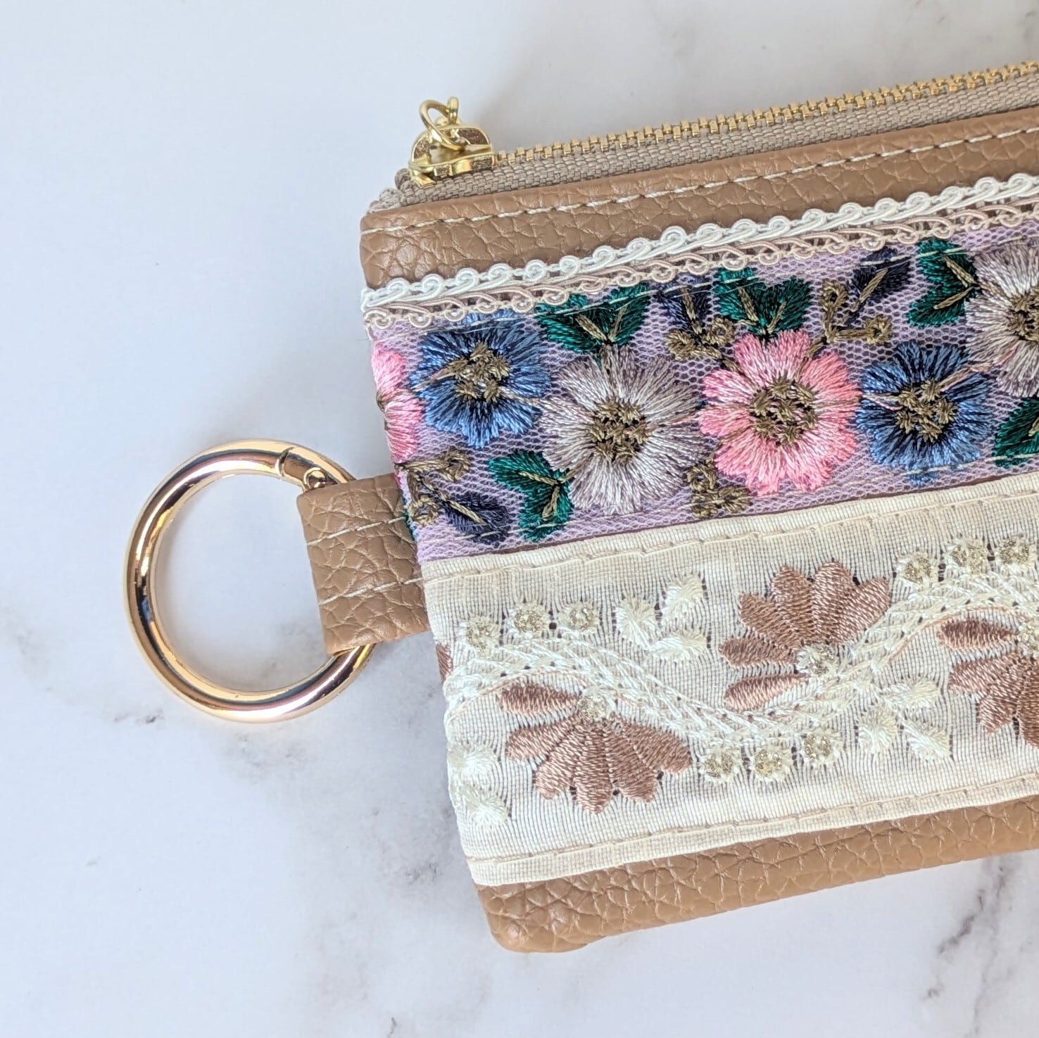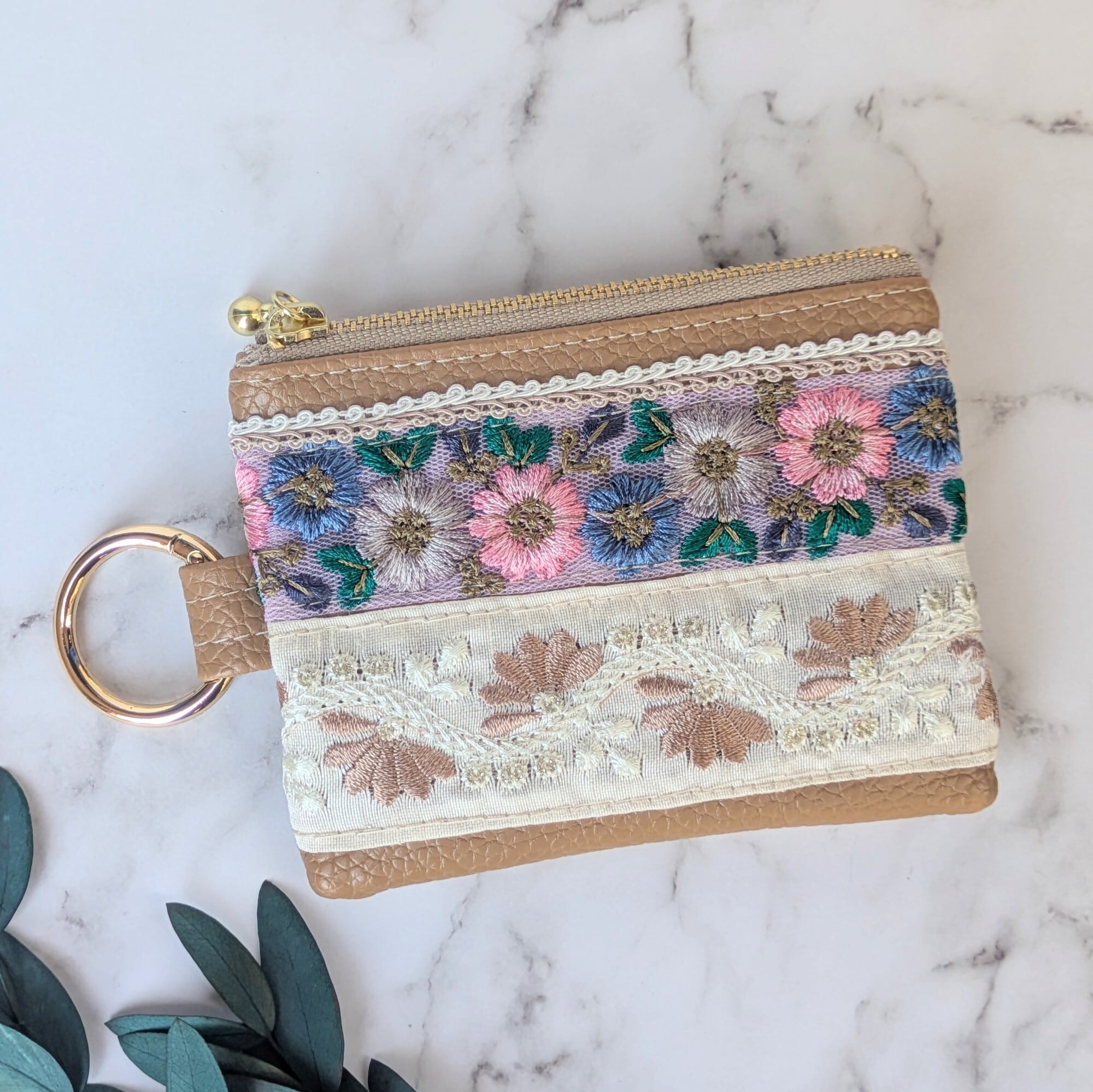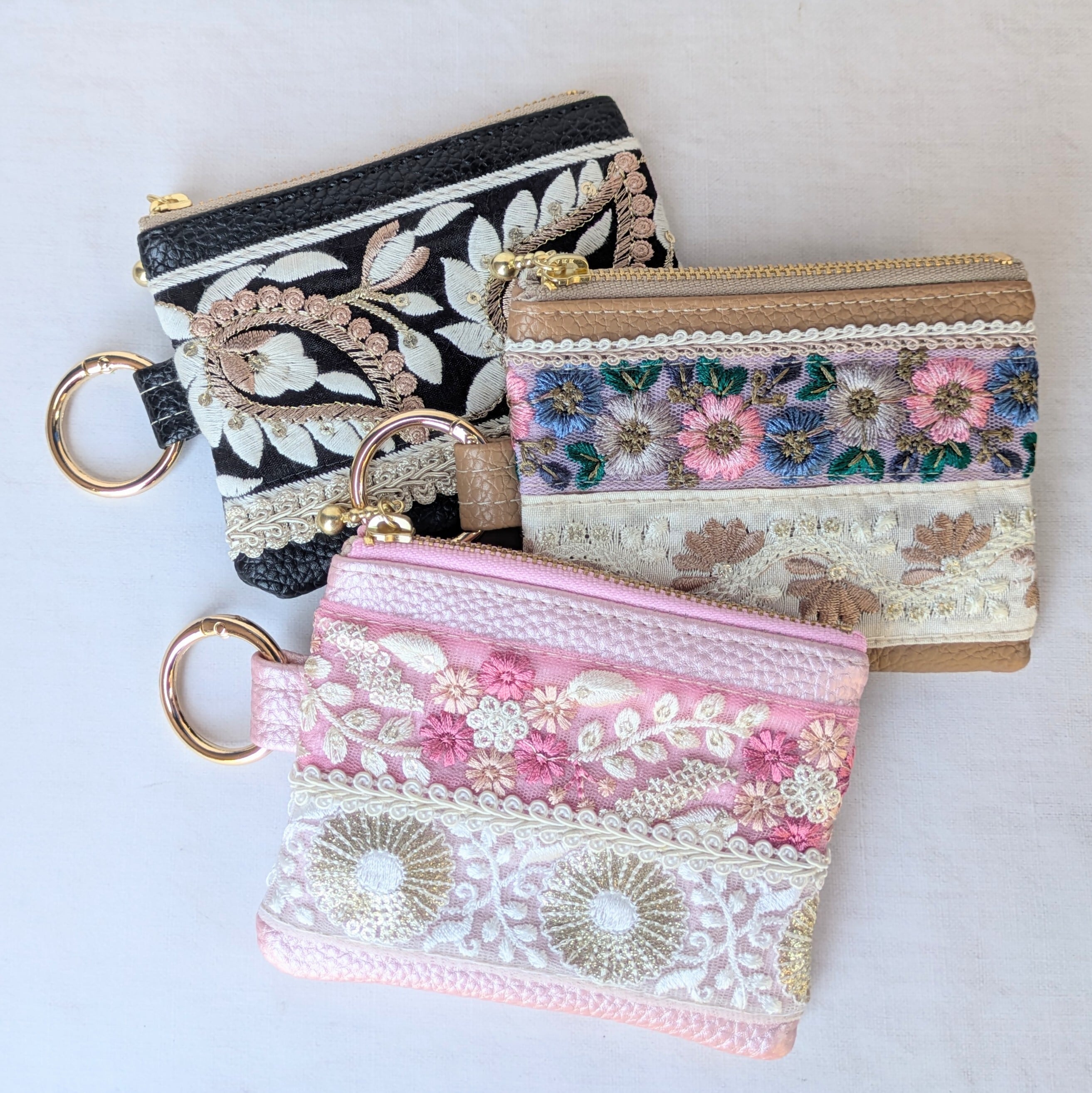 華やかで美しいインド刺繍リボンを贅沢に使った人気のフラットファスナーポーチに、外ポケット付きのミニタイプが仲間入り。