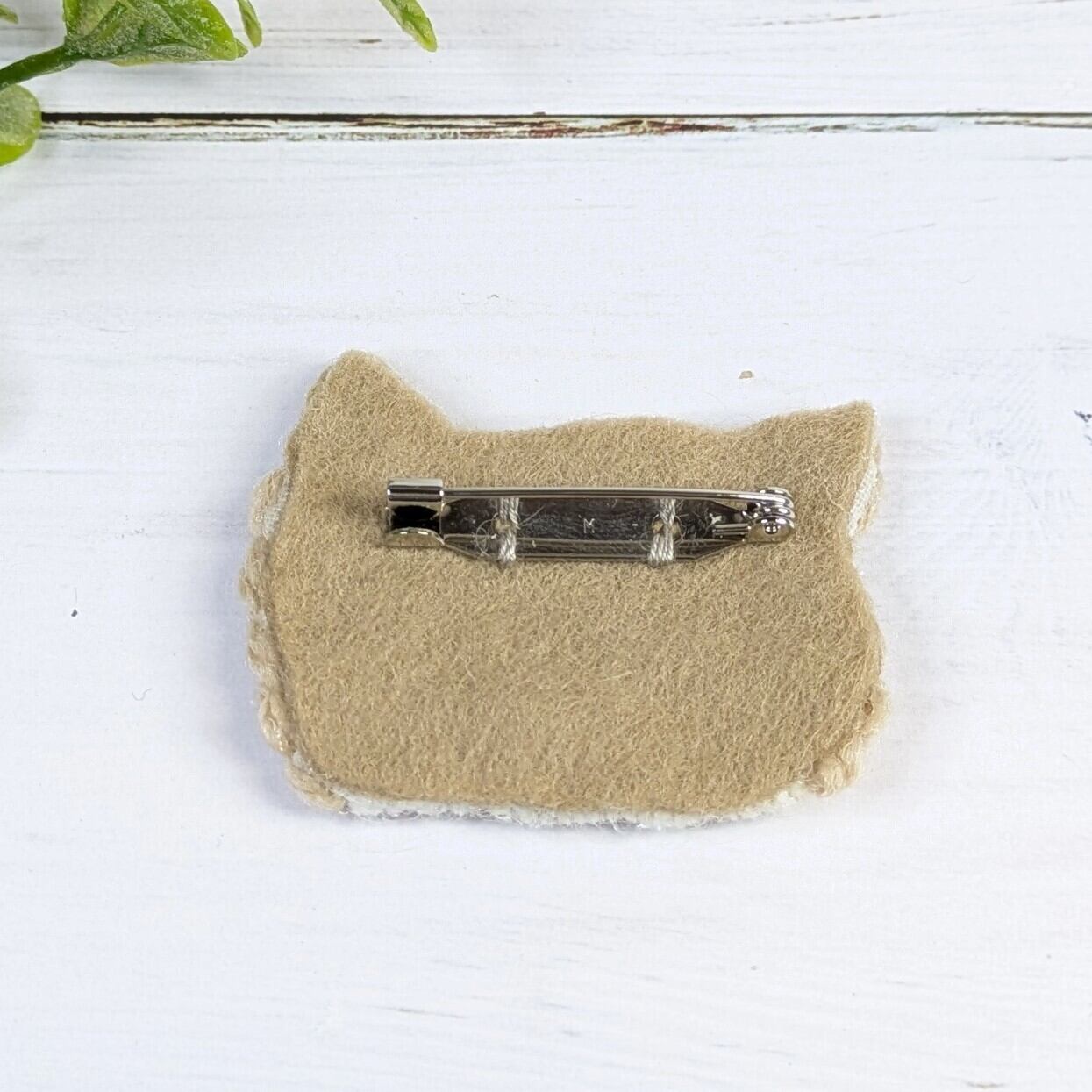 生地にニット刺しゅうを施し、裏側にフェルトを貼り、ブローチピン金具を縫い付けて仕上げています。